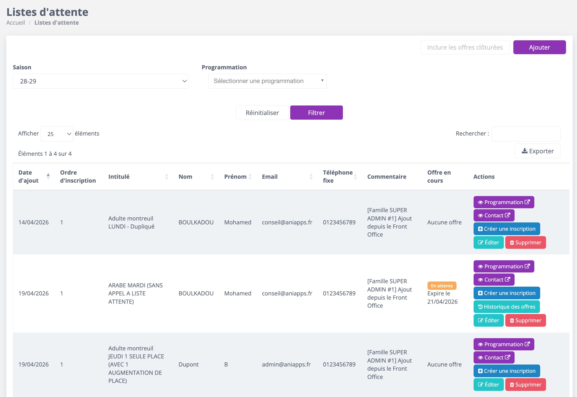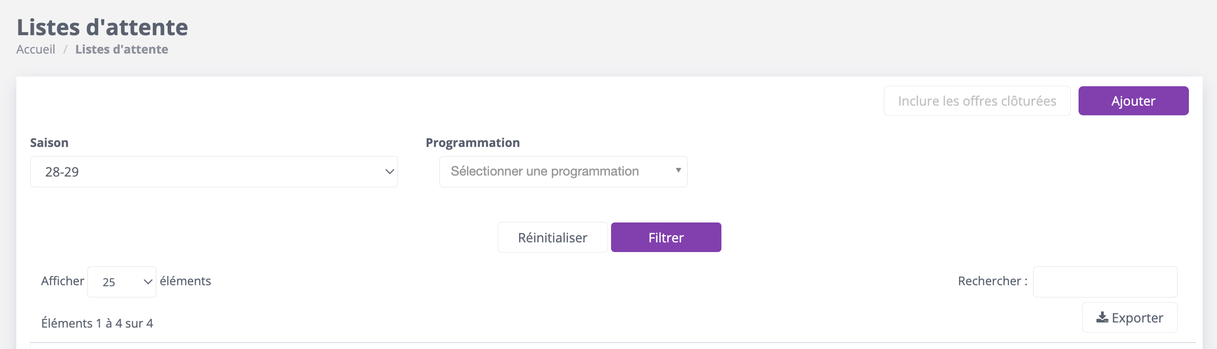 La liste d’attente indique l’ensemble des usagers en attente par programmation ainsi que leur ordre d’inscription.