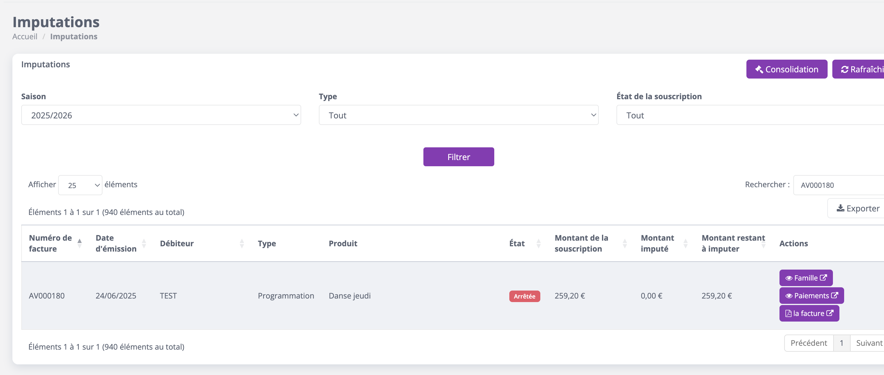 Rendez-vous dans l'onglet "Comptabilité" puis "Imputations". Vous pouvez utiliser le champs "Rechercher"